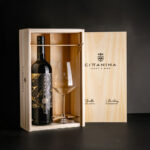 Caja de madera de pino grabada: 1 botella Pasión + copa grabada